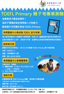 本校為美國 TOEFL Primary 英文檢測桃園地區唯一考場,全台首次測驗為5月27日