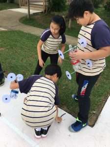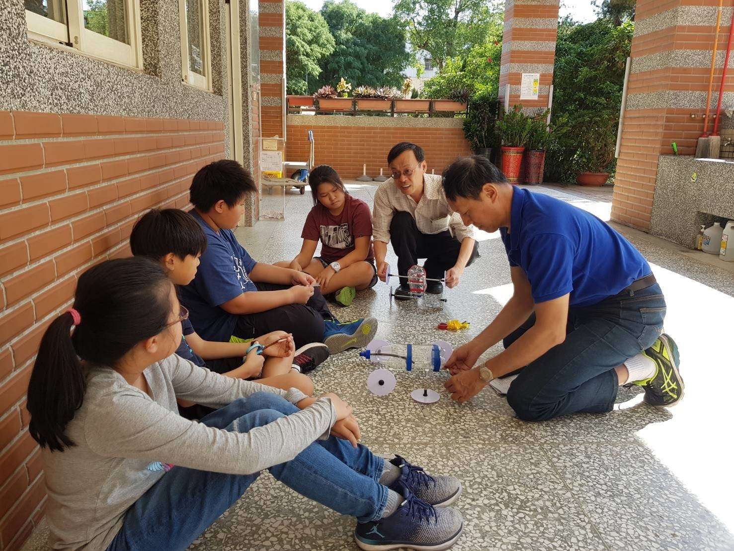 在有得雙語中小學發展的特色課程中,一門別具創意的「科學發明課程」於本學期融入水動力火箭車單元,由官賢相老師指導學生以回收寶特瓶作為火箭車本體,結合廢棄光碟作為車輪,進行組裝與設計後,於瓶身裝水並打氣,將噴嘴打開後水火箭車便得以向前噴射。在做中學的過程,同學們不僅認識了牛頓第三運動定律之作用與反作用原理,更嘗試克服製作與設計的困難,並找出影響車子前進距離、方向、行進穩定的因素等。