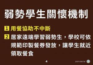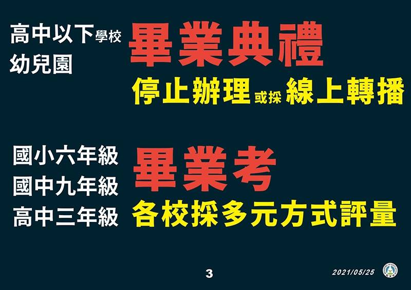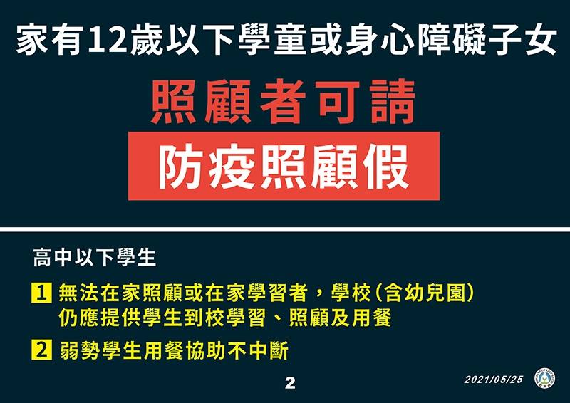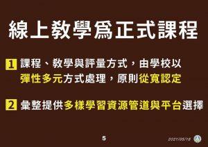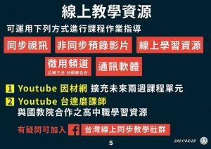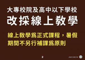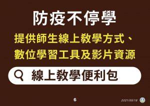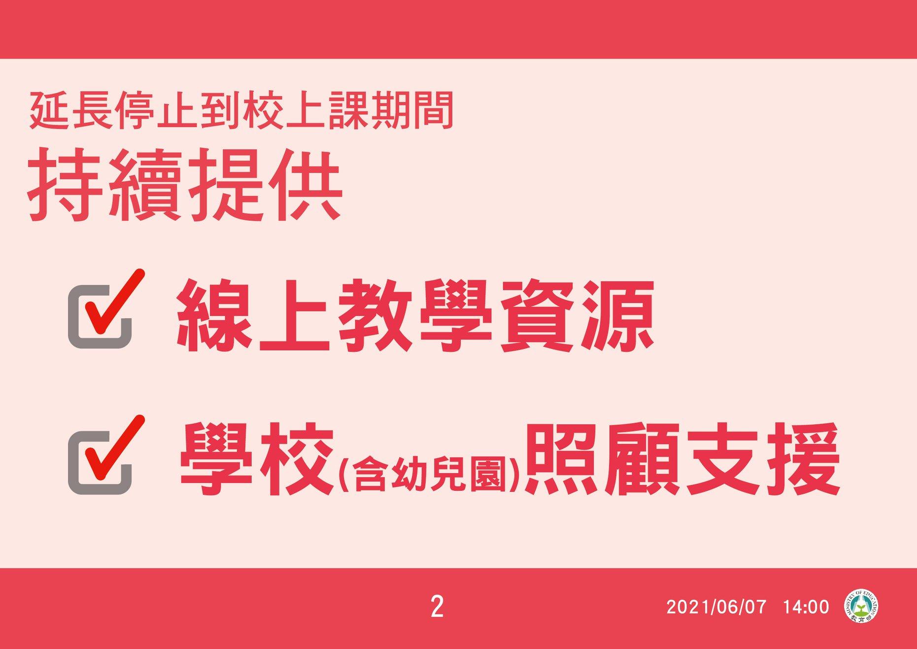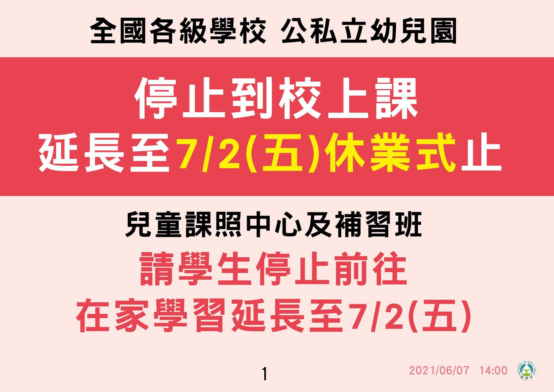 2.110年5月25日教育部宣布,因應警戒時間延長,全國各級學校及公私立幼兒園停止到校上課延長至6月14日(一)