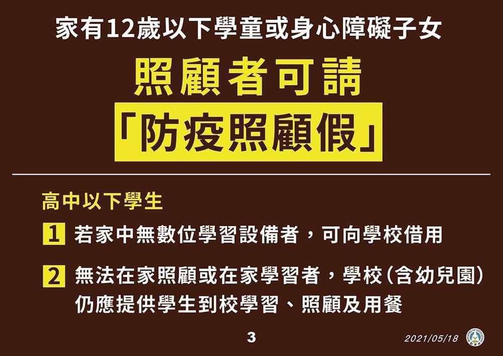 1.因應國內疫情警戒升級,為降低群聚感染之風險,教育部公告自110年5月19日(三)起至5月28日(五)止,全國各級學校及公私立幼兒園停止到校上課,且兒童課後照顧服務中心、補習班等各類教育機構亦同時配合停課,在家學習。