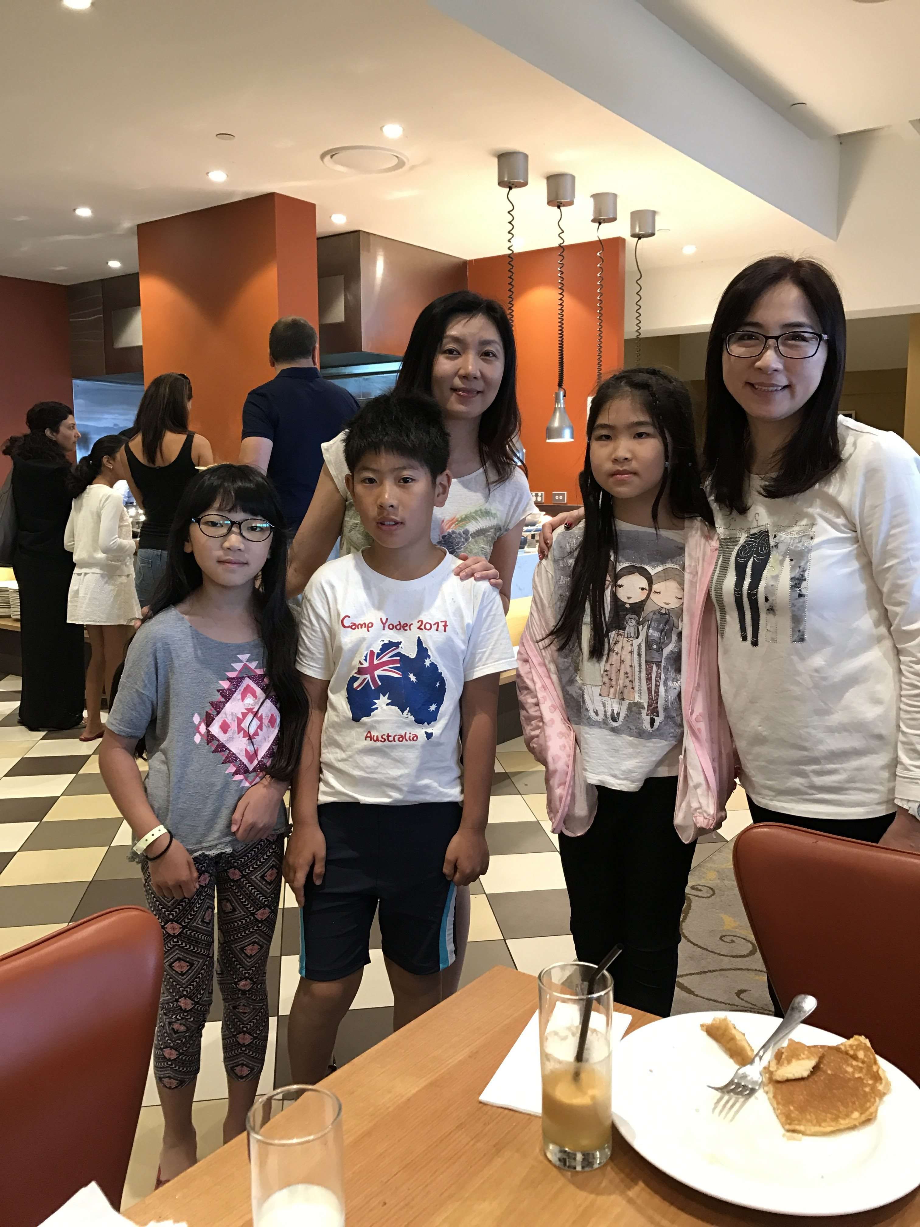 今日安排的行程非常精彩。一早有得學子便集合享用 Fairmont Resort 豐盛的 Buffet 式早餐。Fairmont 的早餐除了有一般美式的培根、火腿、炒蛋等常見的菜色外,還多了可以自行選配的鮮榨果菜汁、現做的歐姆蛋(Omelette)、無限續杯的新鮮果汁和義式咖啡等。同學們無不吃得興高采烈。當大夥都盡興的享用早餐時,突然聽見有人叫了一聲:[謝主任!] 帶隊老師抬起頭一看,原來是本校4B的同學Yosi和媽媽。真是巧合呀!有得團隊竟然在幾千公里外的澳洲藍山國家公園巧遇本校的同學和家長。Yosi原本計畫參加今年的海外冬令營,但是因為家長無法同行而取消了計畫,改為參加國內旅行社舉辦的9天旅行團行程。有得團隊在體驗了六日的營區活動之後,竟然不期而遇的在 Fairmont Resort 遇到 Yosi,可見得真是有緣。當場要求 Yosi 與同班的 Vic 合影留念。